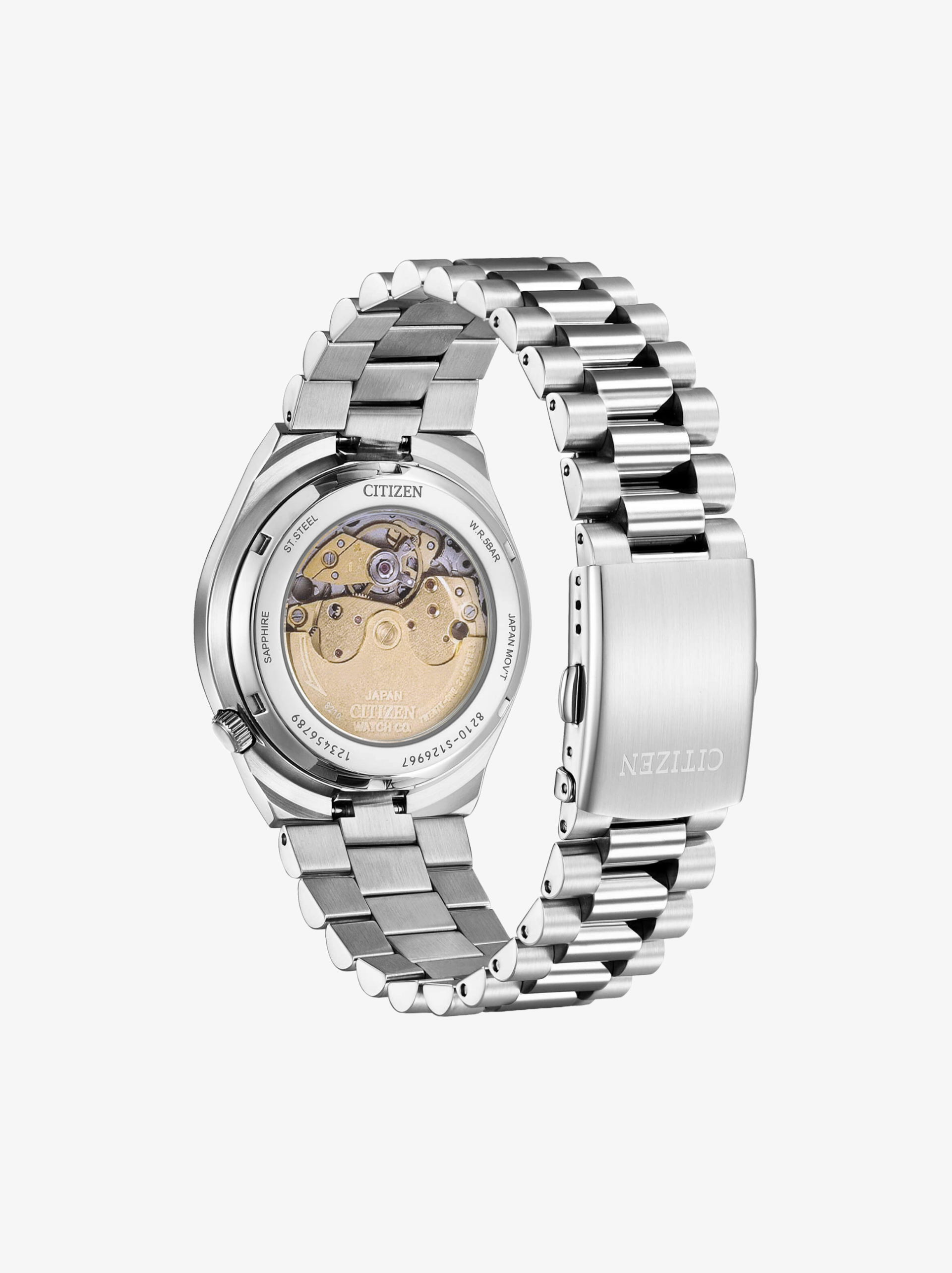 Orologio Uomo solo tempo con movimento automatico Citizen. L'orologio è interamente in acciaio anallergico 316L con chiusura deploiante e cassa da 40mm con quadrante colore champagne. Codice articolo NJ0151-88W.