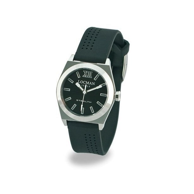 Orologio Locman da donna modello Stealth, solo tempo. Cassa in titanio diametro 33 mm, quadrante nero con indici a bastone. Vetro minerale antigraffio. Cinturino in silicone nero. Impermeabilità 5 ATM. Due anni di garanzia ufficiale Locman. Referenza: 020400BKFNK0SIK.