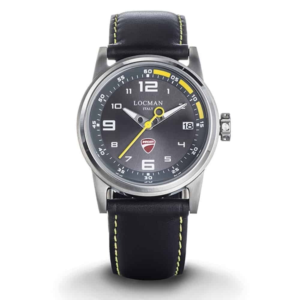 Orologio da uomo Locman Ducati con movimento al quarzo, solo tempo e datario. Quadrante grigio, indici numerici stampati e lancette smaltate gialle. Cassa in acciaio e titanio di diametro 42 mm. Vetro Zaffiro e cinturino in pelle nera con cuciture gialle. Impermeabilità 10 ATM. Due anni di garanzia ufficiale Locman. Referenza: D106A07S-00GYYPKY.