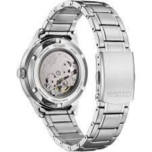 Orologio Citizen Day Date Collezione Meccanico. Movimento meccanico a carica automatica riserva di carica 40 ore, solo tempo e datario. Quadrante blu, indici a bastone e vetro zaffiro. Cassa in acciaio di diametro 40 mm e fondello con oblò trasparente con macchinario a vista. Cinturinio in acciaio e chiusura deployante. Impermeabilità 10 ATM. Cinque anni di garanzia ufficiale Citizen. Referenza: NY4058-79L.