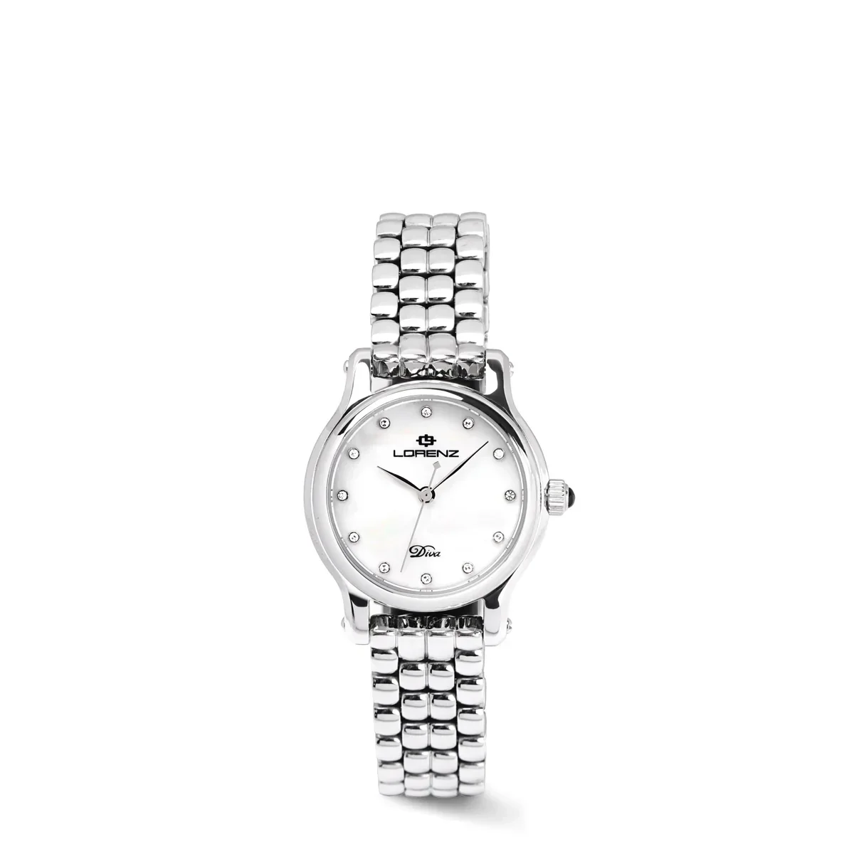 Orologio Lorenz Diva Round. Movimento al quarzo Miyota 2035 solo tempo. Quadrante bianco madreperla con indici impreziositi da 12 diamanti. Cassa in acciaio di diametro 32 mm e vetro zaffiro. Cinturino in acciaio con chiusura butterfly. Impermeabilità 5 ATM. Due anni di garanzia ufficiale Lorenz. Referenza: 030240AA.