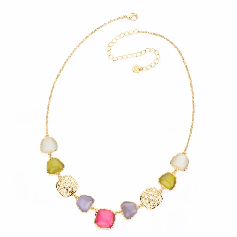 Collana Barbieri Honeycomb. Collana con catena in acciaio gold con cristalli verdi, glicine, bianchi e fucsia. Impreziosita da elementi a forma di nido d'ape con pavè di zirconi. Chiusura a moschettone, lunghezza 45+10 cm regolabile. Due anni di garanzia ufficiale Barbieri. Referenza: CO40041-KD44.