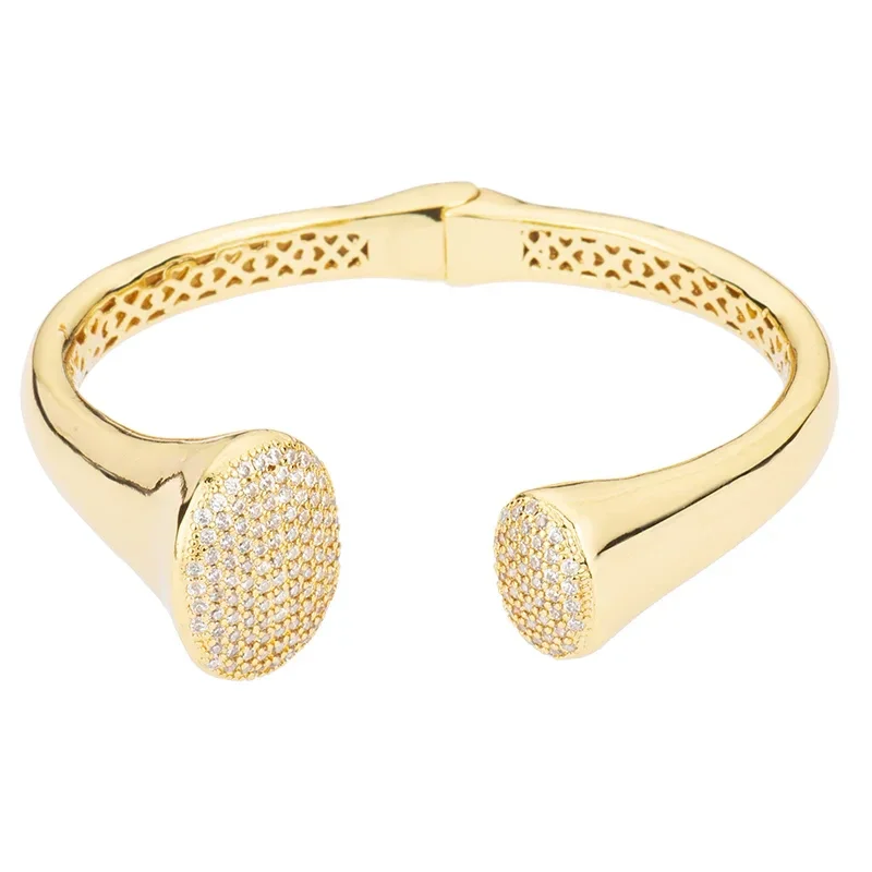Bracciale Barbieri Clou. Bracciale rigido in acciaio gold con design a doppio chiodo è impreziosito da capocchie rifinite in pavé di zirconi. Chiusura a scatto, Diametro 6,8 cm e Larghezza: 0,6/2 cm. Due anni di garanzia ufficiale Barbieri. Referenza: BL40558-XD01