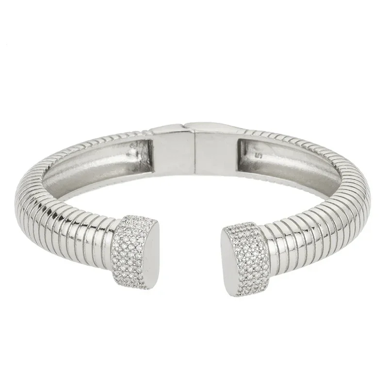 Bracciale Barbieri Robur. Bracciale in acciaio a fascia con effetto tubo gas e rifinito da eleganti elementi finali impreziositi da pavé di zirconi. Chiusura a scatto, Diametro 6,8 cm e Larghezza: 1 cm. Due anni di garanzia ufficiale Barbieri. Referenza: BL40556-XR06