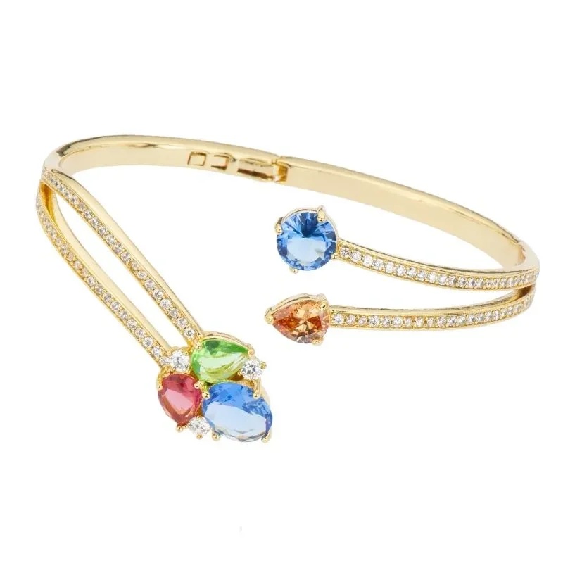Bracciale Barbieri Multicolor. Bracciale in acciaio gold rigido impreziosito da cristalli centrali con fasce in pavè di zirconi. Chiusura a scatto diametro 6,8 cm. Due anni di garanzia ufficiale Barbieri. Referenza: BL40209-XD44.