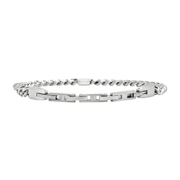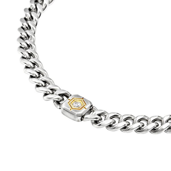 Bracciale Uomo Breil Cross Roads. Bracciale in acciaio catena groumette in acciaio, con finish satinato è caratterizzata da un elemento centrale bicolour dalle linee geometriche che accoglie un cubic zirconia bianco incastonato. Chiusura facilmente regolabile. Lunghezza 22 cm. Due anni di garanzia ufficiale Breil. Referenza:TJ3815