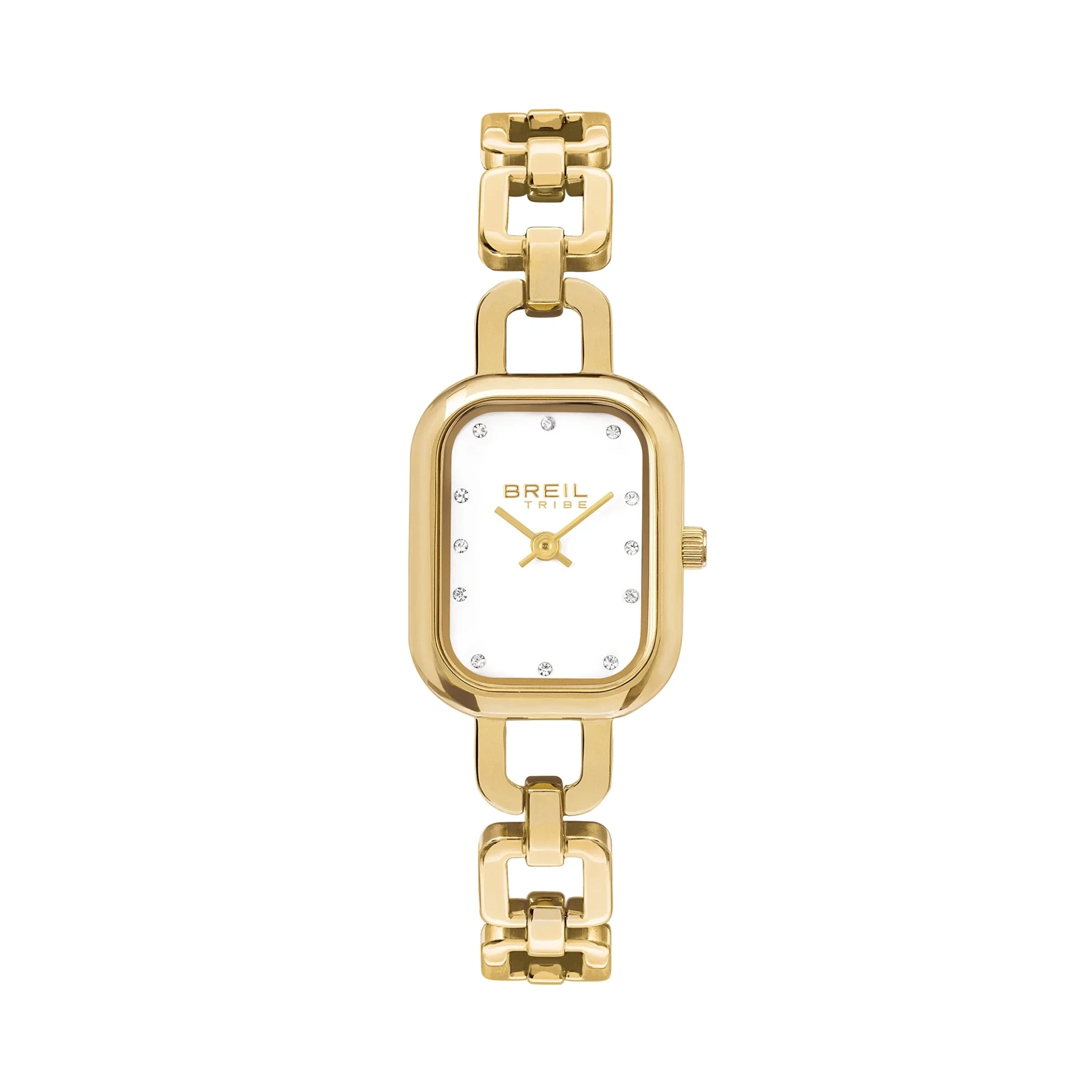 Orologio Donna Breil Bon Ton. Orologio solo tempo e movimento al quarzo. Quadrante bianco, indici con zirconi e vetro minerale antiriflesso. Cassa in acciaio gold rettangolare e diametro 28 mm. Cinturino in acciaio gold. Impermeabilità 3 ATM. Due anni di garanzia ufficiale Breil. Referenza: EW0813.